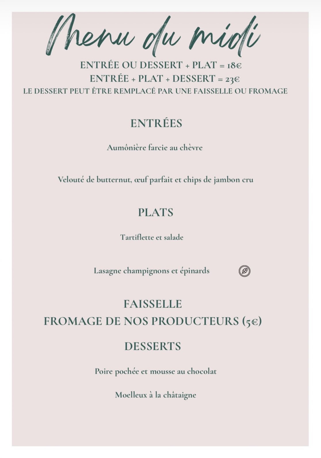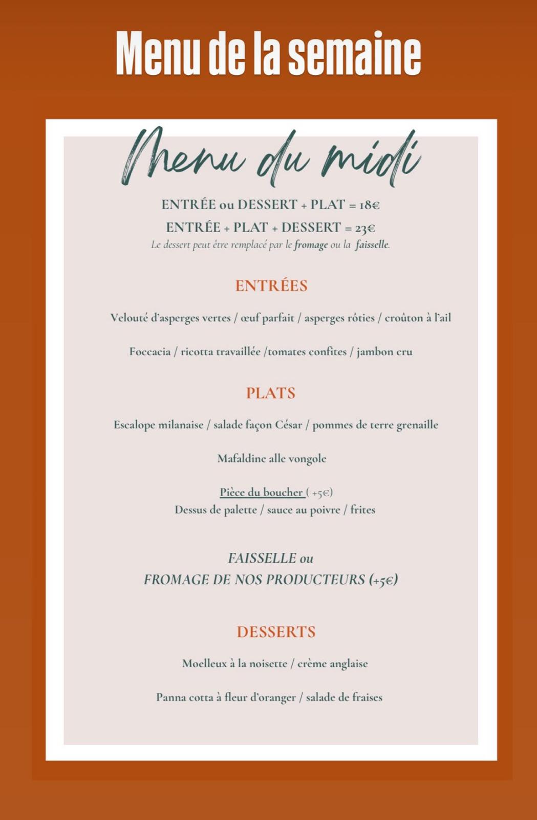Menu MIDI En SEMAINE Les Mercredi, jeudi, vendredi Entrée Plat ou Plat Dessert : 18€ Entrée Plat Dessert : 23 € Cette semaine